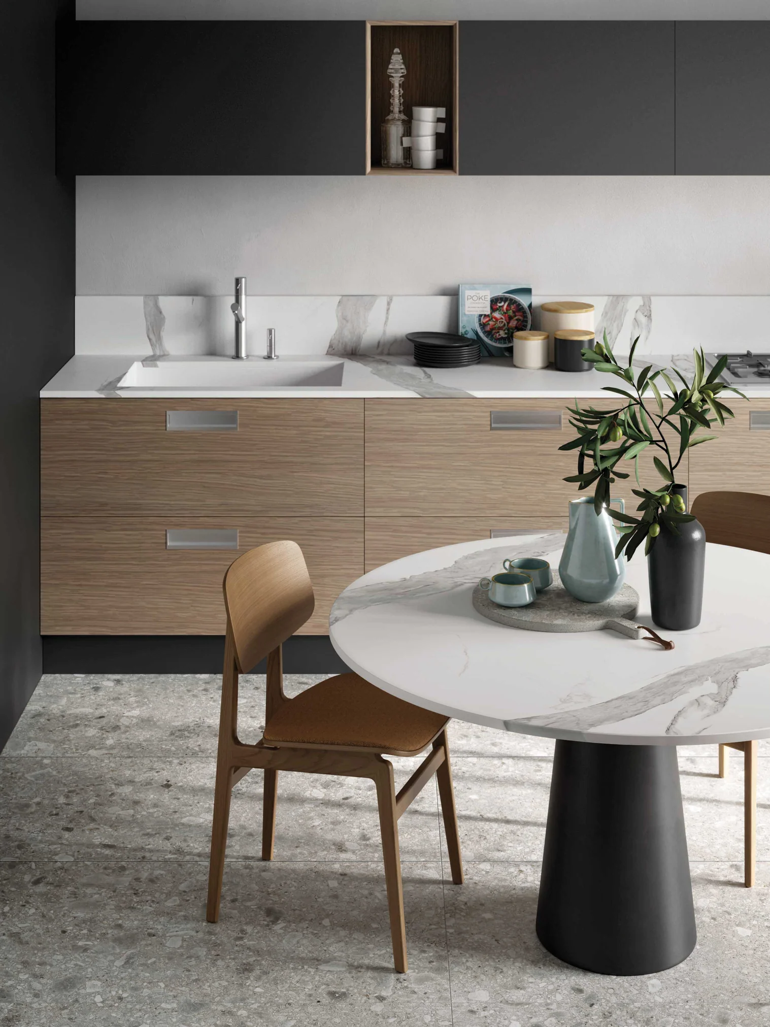 ABKSTONE se fabrica también en 6mm de espesor, lo que permite combinar puertas de cocina y encimeras del mismo material.
